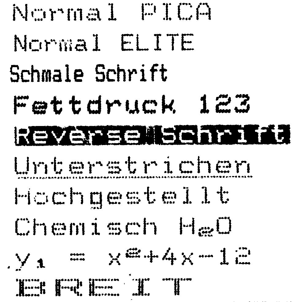Die von dem Referenzdrucker der Preisklasse II Star (siehe Artikel »So testen wir« in dieser Ausgabe) gewohnte Vielfalt an Schriftarten und Darstellungsformen findet man beim Microline 182 nicht. Allerdings reicht das Angebot für den üblichen Druckeralltag aus. Pica, Elite, Schmal- und Breitschrift, Fettdruck, Hoch- und Tiefstellen sowie Negativschrift sind als Features vorhanden (Bild 2 und 3). Auch kann mittels ESC-Befehlen zwischen den Zeichensätzen hin- und hergeschaltet werden. Gerade diese Zeichensätze sind es, die den Microline 182 von anderen Druckern unterscheiden. Während man bei vielen Druckern, die sich anstrengen, möglichst gut an den C 64 angepaßt zu sein, keine Umlaute findet, hat der ML 182 sie. In einem der zehn Zeichensätze wurde einfach auf ein paar (unwichtige) Grafikzeichen verzichtet und der Zeichensatz an den richtigen Stellen mit den deutschen Sonderzeichen ausgestattet.