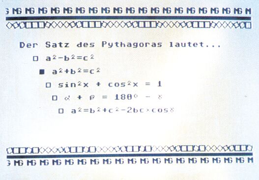 Erstellen Sie nun eine Frage, so müssen Sie die möglichen Antworten mit einem »@« kennzeichnen, welcher als kleines Quadrat sichtbar wird. Die richtige Antwort ist mit einem reversen Klammeraffen (»@«) kenntlich zu machen. Sie können dieses aber auch unterlassen und die richtige Antwort erst beim Speichern per Menüauswahl kennzeichnen. Wenn Sie nun eine Frage speichern wollen, so wählen Sie den Punkt »Bild speichern« an. Falls Sie noch keine Antwort markiert haben, können Sie dieses hier nachholen. Geben Sie nun eine Nummer ein, die nicht Null und nicht größer als die maximale Anzahl ist. Haben Sie sich vertippt, so geben Sie einfach die richtige Nummer ein und die falsche wird nach links aus der Anzeige herausgeschoben. So können Sie ein Bild auch als Titelbild von Ihrem Quiz oder vom »Quizmaster« verwenden. Dazu benutzen Sie die entsprechenden Funktionen.