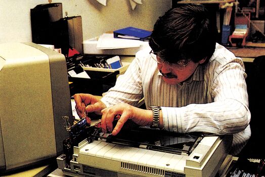 Es sind nun genau zwei Jahre, seit es Ihre 64’er gibt, sie wird von Fachredakteuren gemacht, die sich seit vielen Jahren mit der Materie Computer und allem was dazugehört beschäftigen. Im Laufe der Zeit sammelt so ein Redakteur (Bild 1) eine Menge Erfahrung. Daraus entwickeln sich Meß- und Testverfahren, die zum einen einen objektiven Vergleich verschiedener Produkte und zum anderen ein möglichst präzises Testergebnis ermöglichen. So haben wir beispielsweise einen Drucker-Test entwickelt, der versucht, belegbare Meßdaten (Labortest) mit dem tatsächlichen Nutzen des Gemessenen (Praxistest), zu vereinigen. Dieses Testverfahren wollen wir Ihnen kurz beschreiben. Jeder Drucker, der getestet werden soll, muß zunächst über unsere Meßstrecke. Dabei wird festgestellt, wie schnell er tatsächlich ist ohne Beeinflussung durch Programm, Schnittstelle oder Zeilenvorschub im reinen Zeichendruck. Falls der Drucker einen NLQ-Modus besitzt, wiederholen wir diesen Test mit der NLQ-Schrift (dann allerdings durch den Computer gesteuert). Diesen Wert vergleichen wir mit den Angaben des Herstellers. Falls sich eine Abweichung ergibt, finden Sie diesen Wert in der Tabelle und/oder dem Text wieder. Der nächste Test besteht aus einem genau 8 KByte langen Probetext, der alle die Geschwindigkeit beeinflussende Faktoren berücksichtigt. Dazu gehören das Drucken von einzelnen Zeichen Qe eines am linken und rechten Rand), von halben Zeilen (Drucklogiktest), ganzen Zeilen mit verschiedenen und Zeilen mit gleichen Buchstaben (wichtig für Typenraddrucker, um die Drehgeschwindigkeit zu ermitteln) und einem Absatz von Fließtext mit Sonderfunktionen. Der letzte Teil des Tests besteht aus hundert Zeilenvorschüben, denn auch die sind wichtig. Die so ermittelte Druckzeit stellt einen Durchschnitt über alle Leistungen des Druckers dar. Wir halten es für wenig sinnvoll, jedes Einzelergebnis des Probetextes zu veröffentlichen, denn wer druckt normalerweise schon 1000mal den Buchstaben »A« in einer Zeile. Es ist vielmehr wichtig, eine Vergleichszahl zu finden, die es ermöglicht, verschiedene Drucker auch über längere Zeiträume miteinander zu vergleichen. Der letzte Teil unseres Tests besteht darin, daß der Redakteur seinen Redaktionsdrucker wegstellt und an dessen Stelle mit dem Testgerät praktisch arbeitet. In dieser Zeit werden alle Funktionen des Druckers ausprobiert, seine Handhabung bewertet und versucht, Anpassungen an verschiedene Programme zu machen. Außerdem werden alle zur Verfügung stehenden Erweiterungen wie Einzelblatteinzug und verschiedene Schnittstellen durchgetestet.