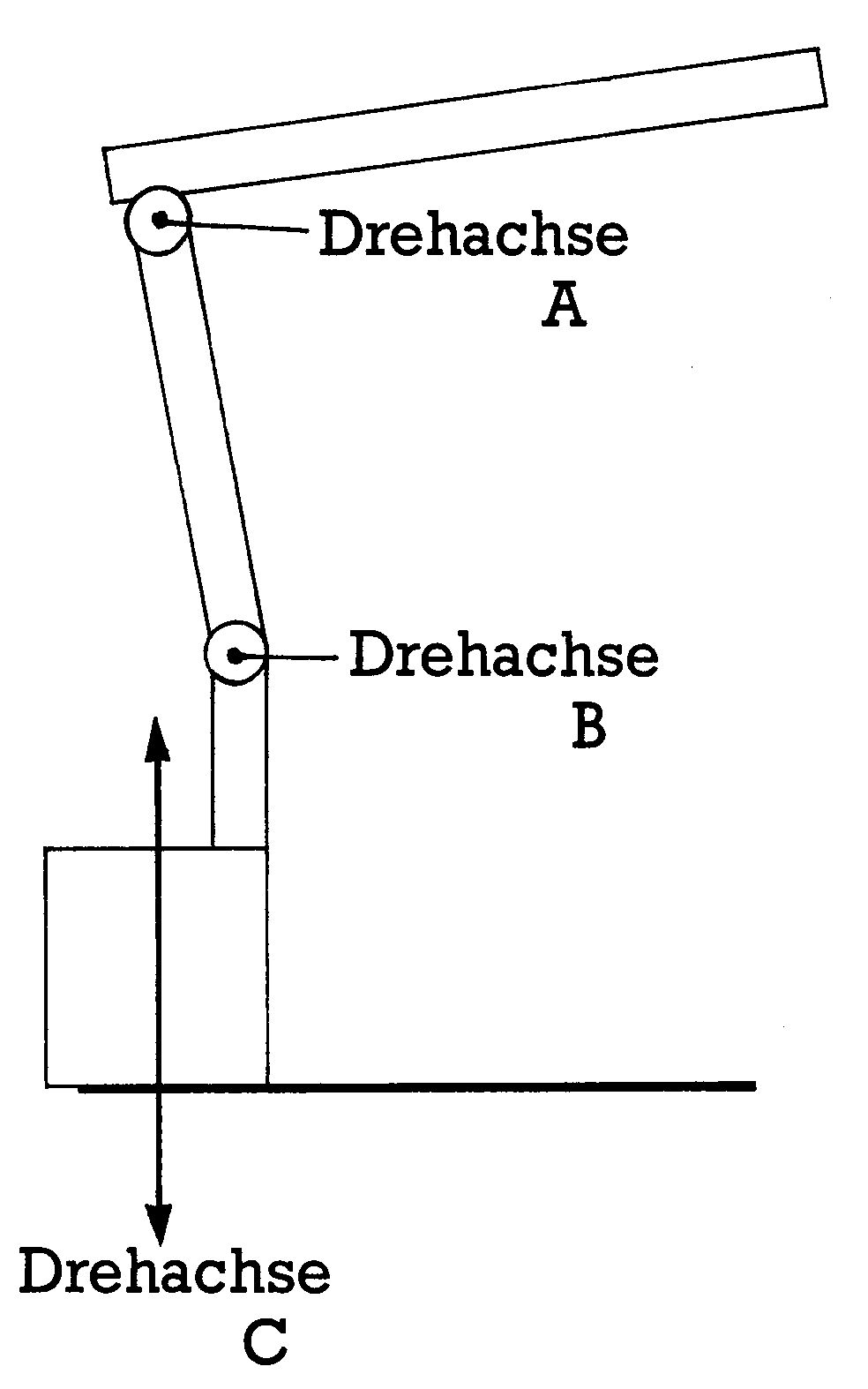 Vielen Robotern diente der menschliche Arm als Vorbild. Auch der Roboter von Fischertechnik besteht aus einem Ober- und einem Unterarm. Beide drehen sich um je eine Achse. Im Bild 2 finden Sie die beiden Achsen — bezeichnet mit Drehachse A und B. Damit der Roboter jeden Punkt seiner Umgebung anfahren kann, muß eine horizontale Drehung ebenfalls möglich sein (Bild 2, Achse C). Man spricht deshalb bei diesem Roboter von einer dreiachsigen Bewegung, für die auch drei Antriebsmotoren notwendig sind. Einmal abgesehen von den mechanischen Grenzen, kann der Roboter so jeden beliebigen Punkt erreichen. Sie brauchen die einzelnen Motoren nur für eine bestimmte Zeit einzuschalten und der Roboter hat die entsprechende Position erreicht.