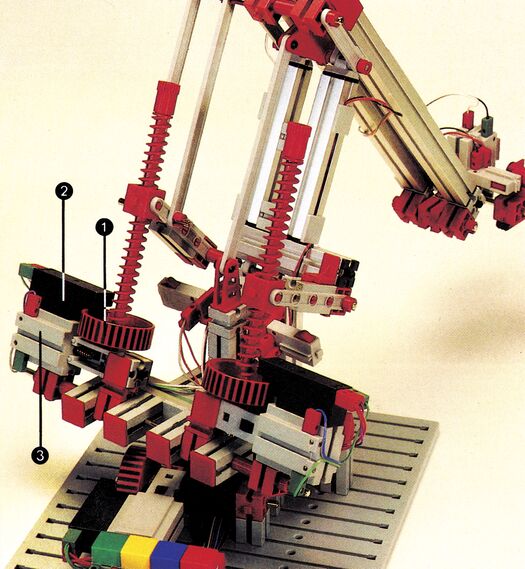 Drei solcher Wegmeßsysteme befinden sich auch am Fischertechnik-Roboter. An jeder Bewegungsachse sitzt ein System. In Bild 4 finden Sie eines der Wegmeßsysteme gekennzeichnet (1 = Digitalscheibe, 2 = Meßwertgeber). Damit die Messung nicht von äußeren Lichteinflüssen gestört werden kann, verwendet Fischertechnik ein Infrarot-Meßsystem. Dabei läßt der rote Kunststoff Infrarotlicht durch.