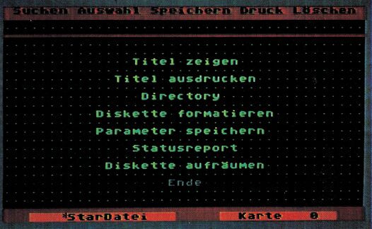 Bekannt und berühmt ist das Textverarbeitungsprogramm »StarTexter«. Wer damit schon einmal gearbeitet hat, kommt auf Anhieb mit »StarDatei« gut zurecht. Viele Operationen sind ähnlich. Es gibt hier genauso einen Control-Modus, in dem man mit der »CTRL-Taste« gelangt (Bild 1), der auch die Menüauswahl (es stehen drei zur Verfügung) steuert.