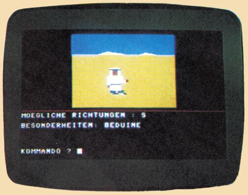 Auf der Suche nach der goldenen Totenmaske des Pharao müssen Sie hier die erste Aufgabe lösen. Eine Menge Programmzeilen sind auf dem Weg in die Wüste, in der das Grab des Pharao steht, einzutippen. Damit Sie nicht hier schon »in der Wüste der Fehlermeldungen« stehen, ist auch dieses Programm mit dem Checksummer einzugeben. Liegt diese Hürde hinter Ihnen, wird Ihnen ein freundlicher Beduine, sobald Sie Ihn gefunden haben, den richtigen Weg weisen.