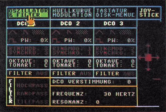 Man befindet sich dann auf der ersten von drei Bildschirmseiten. Die am Bildschirm sichtbare Hand läßt sich mit Hilfe des Joysticks in jede Richtung bewegen. Durch erneutes Drücken des Feuerknopfes kann der jeweilige Parameter eingestellt, beziehungsweise verändert werden. Soll beispielsweise bei Oszillator 1 eine Sägezahnwelle eingeschaltet werden, so muß man lediglich die Hand auf das Sägezahn-Symbol steuern und den Knopf am Joystick drücken. Sogleich wird das Symbol grün, weil damit der Oszillator auf diese Wellenform umgestellt wurde. Drückt man an gleicher Stelle den Knopf ein weiteres Mal, leuchtet das Symbol wieder rot als Zeichen dafür, daß der Oszillator keinen Sägezahn-Ton mehr erzeugt. Diese Farben wurden im gesamten »Happysynth« beibehalten: Grün bedeutet immer, daß irgendeine Funktion oder ein Parameter eingeschaltet ist, rot signalisiert, daß die Funktion, beziehungsweise der Parameter ausgeschaltet ist. Bei Parametern, die sich nicht nur ein- und ausschalten lassen, sondern stufenlos reguliert werden, bedient man sich ebenfalls des Joysticks. Will man zum Beispiel die Pulsbreite einer Stimme verändern, so bewegt man die Hand zu der entsprechenden Stelle am Bildschirm und drückt den Feuerknopf.