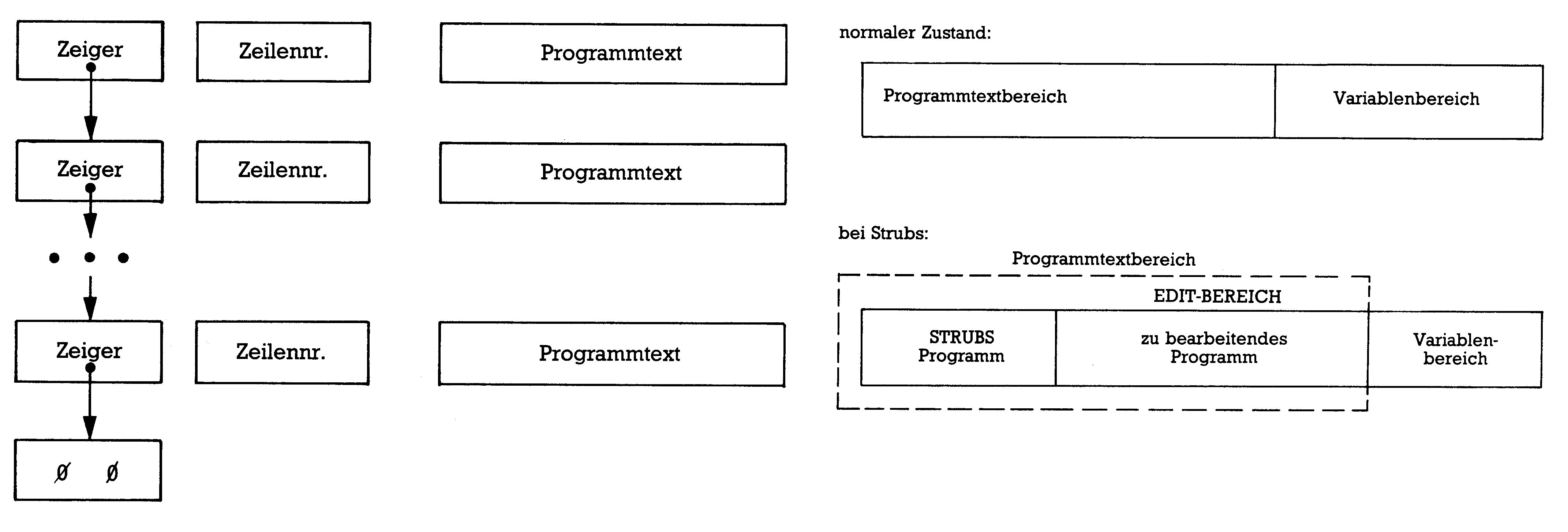 Wenn wir mit Strubs arbeiten, haben wir es — wie bei jedem Compiler — mit (mindestens) drei Programmen zu tun: Dem Übersetzungsprogramm, dem Quellcode (Quellprogramm) und dem lauffähigen Objektprogramm. Diese Programme müssen sich nun irgendwie den zur Verfügung stehenden Speicherplatz teilen. Daß das Übersetzungsprogramm, um arbeiten zu können, im Hauptspeicher stehen muß, versteht sich von selbst.