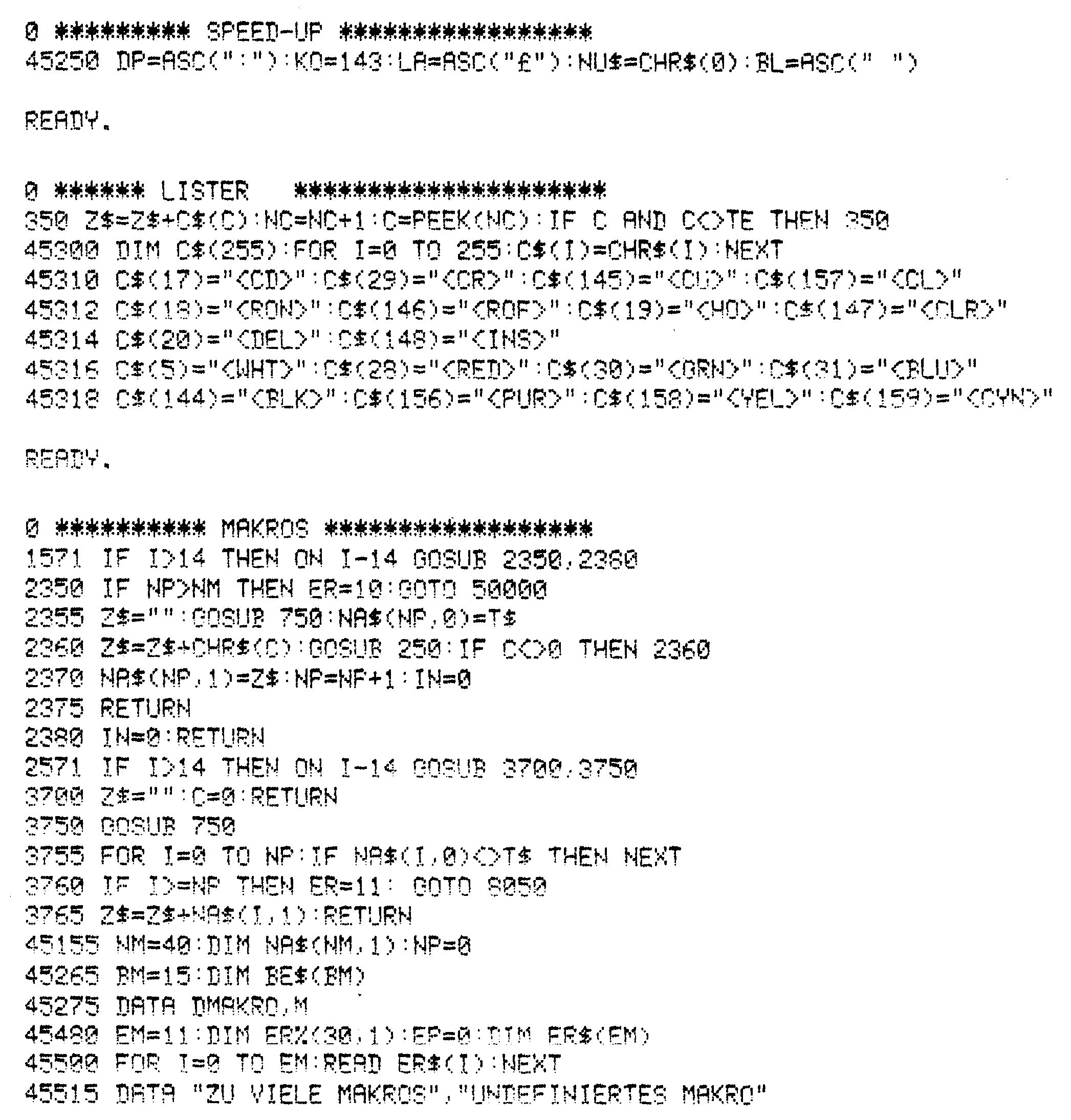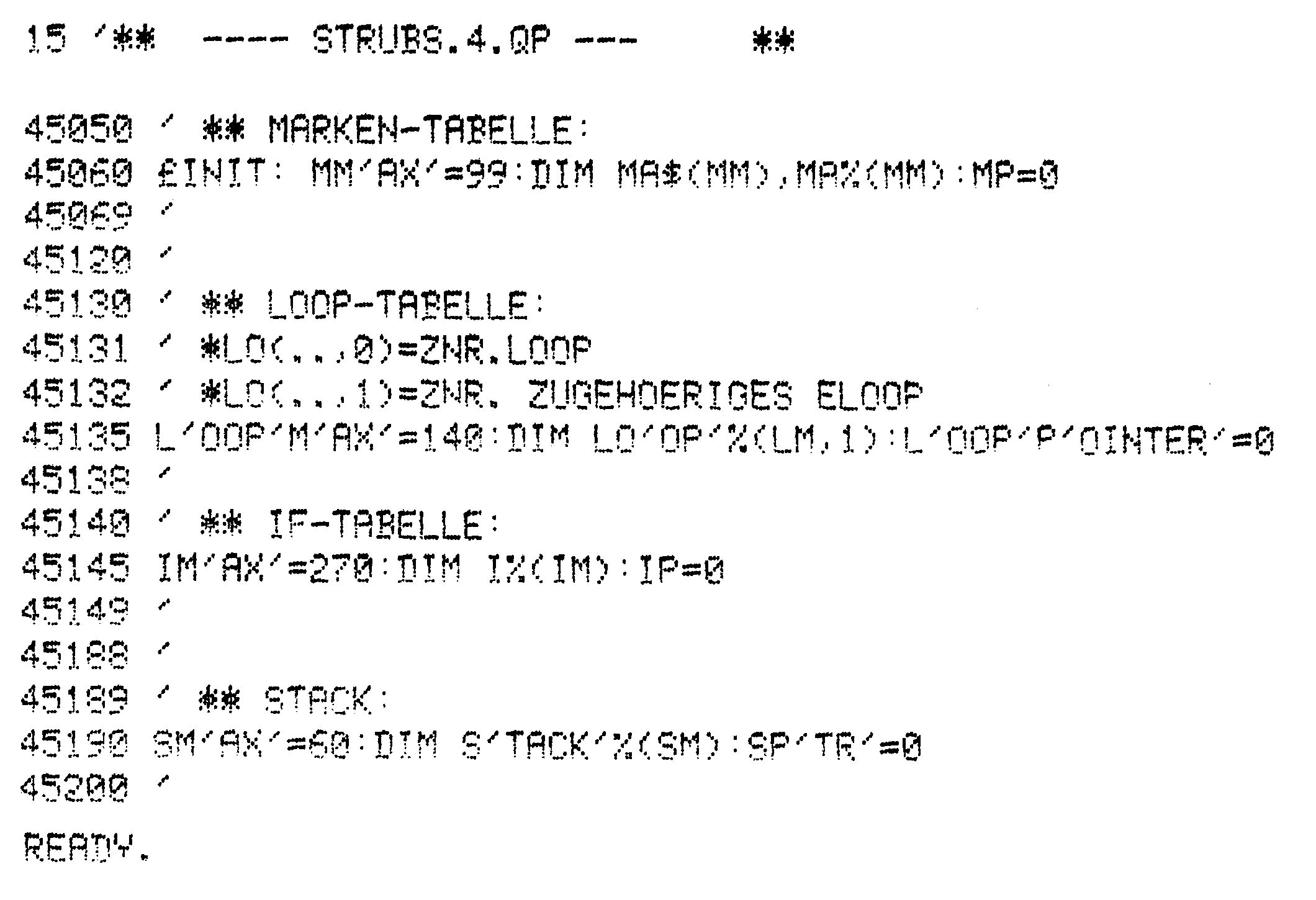 Die Methode der Vorübersetzung zur Erhöhung der Laufgeschwindigkeit benutzt im übrigen auch der Basic-Interpreter des Commodore 64. Und zwar findet sich die Übersetzungsfunktion im Editor: Sofort bei der Eingabe einer Zeile werden die Basic-Befehle, die aus mehreren Zeichen bestehen, in nur 1 Byte lange Zeichen, die sogenannten TOKENS, übersetzt. Eine Liste dieser Tokens findet sich zum Beispiel im Programmierhandbuch zum VC 20. Diese Vorübersetzung bringt zwar einen schönen Gewinn an Geschwindigkeit, hat allerdings den Nachteil, daß Programmtexte nicht mehr mit komfortableren Editor- beziehungsweise Textprogrammen erstellt werden können. Für uns ist jedoch vor allen Dingen wichtig, daß diese TOKENS berücksichtigt werden müssen, falls der Befehlsvorrat von Strubs erweitert werden soll, oder falls Programme für Interpretererweiterungen wie Simons Basic bearbeitet werden sollen. Aber auf diesen Punkt werden wir ein anderes Mal ausführlicher eingehen.