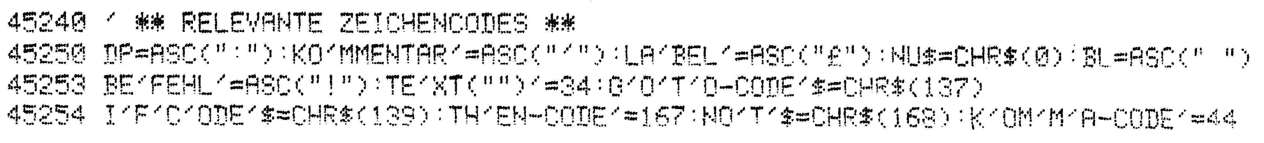 Das wichtigste Hilfsmittel zur Unterstützung modularer Programmentwicklung stellen sicherlich die lokalen Variablen dar. Leider gibt es solche nicht in Basic und auch Strubs kann keine lokalen Variablen bieten. So ist es auch weiterhin erforderlich, beim Einsetzen oder Ändern eines Moduls darauf zu achten, ob und an welchen Stellen Variablen des Moduls in anderen Programmteilen benutzt werden, und gegebenenfalls Umbenennungen vorzunehmen. Der zweite große Nachteil von Basic — die leidigen Zeilennummern — braucht uns dagegen nur noch wenig zu beschäftigen. Strubs bietet alle Möglichkeiten, die erforderlich sind, um ein Programm vollkommen unabhängig von Zeilennummern zu schreiben Als erstes sind da natürlich die oben besprochenen Kontrollstrukturen zu nennen. Darüber hinaus können bei allen Sprüngen Zeilennummern durch Labels (Marken) ersetzt werden. Solche Labels werden durch das Zeichen »£« gekennzeichnet und abgeschlossen durch ein Leerzeichen, Doppelpunkt, Komma oder Zeilenende. Die dürfen zwar reservierte Basic-Worte enthalten, dann können sich aber wegen der in der letzten Folge erwähnten Tokens bei der Ausgabe der Markentabelle seltsame Effekte ergeben. Die Labels werden definiert, indem sie an den Anfang einer Zeile gesetzt werden und können beliebig lang sein:
