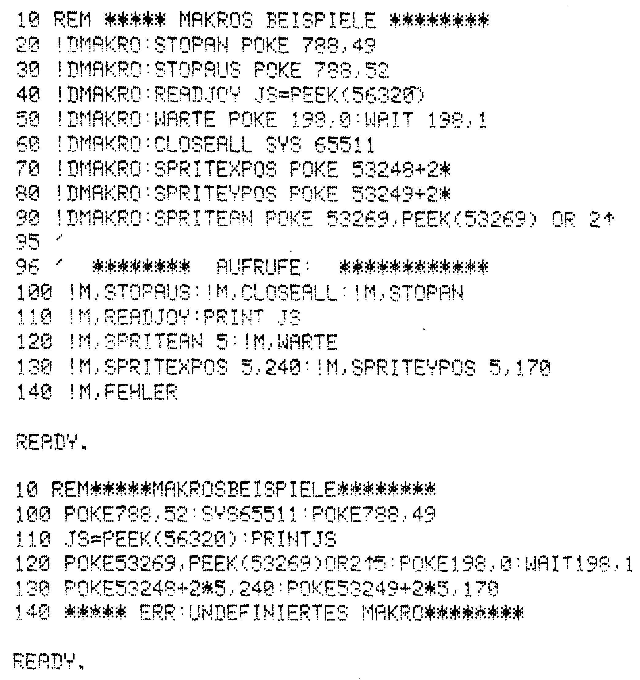 Um nun aber auf das Programm Strubs zurückzukommen: Auch hier haben wir es in gewisser Hinsicht mit einer Mischform zu tun. Das selbst nicht lauffähige Quellprogramm, welches der Programmierer unter Benutzung der neuen Befehle erstellt, wird von Strubs nicht in Maschinensprache übersetzt, sondern in ein normales Basic-Programm, das dann wie bisher interpretiert wird. Dabei werden Programmteile, die keine Erweiterungen enthalten, mehr oder weniger unverändert übernommen. Dieses von Strubs erzeugte Objektprogramm kann nun wie jedes andere Basic-Programm — auch mit Hilfe von Toolkits — gelistet, ausgetestet und sogar geändert werden. Schließlich ist es dann noch möglich, dieses Objektprogramm mit Hilfe eines Basic-Compilers, wie zum Beispiel dem Austro Compiler, weiter zu übersetzen. Besonders hilfreich ist es, daß einander entsprechende Programmzeilen im Quellprogramm und im Objektprogramm gleiche Zeilennummern besitzen, so daß der Programmierer sich ohne Schwierigkeiten im Objektraum zurechtfinden kann. Gegenüber der Methode, den Basic-Interpreter zu erweitern, bietet dieses Verfahren Geschwindigkeitsvorteile: Diese ergeben sich einerseits aus der Tatsache, daß alle Kommentare und Leerzeichen gelöscht werden können, andererseits wird wie beim Compiler ein Teil der Sucharbeit während der Übersetzung erledigt. Dadurch werden zum Teil erst neue Anweisungen ermöglicht, deren Realisierung im Rahmen einer Interpretererweiterung zu aufwendig wäre.