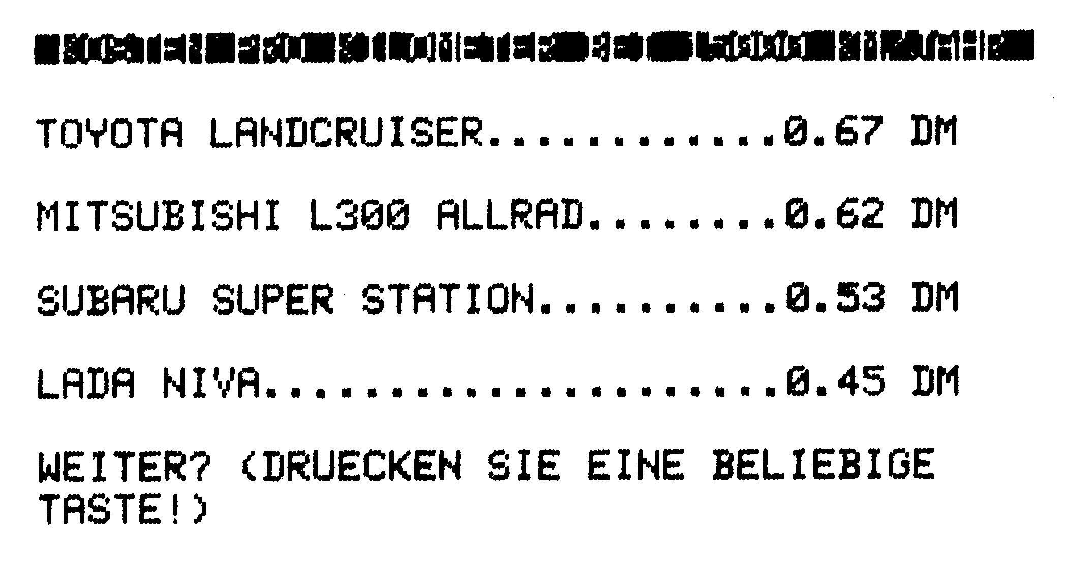Beispiele: Anhängerkupplung, Sperrdifferential etc. Bis zu fünf Bezeichnungen, nach denen im weiteren Programmablauf auch bei den anderen Wagen gefragt wird.) - Für wieviel Mark wird Ihr alter Wagen in Zahlung genommen?