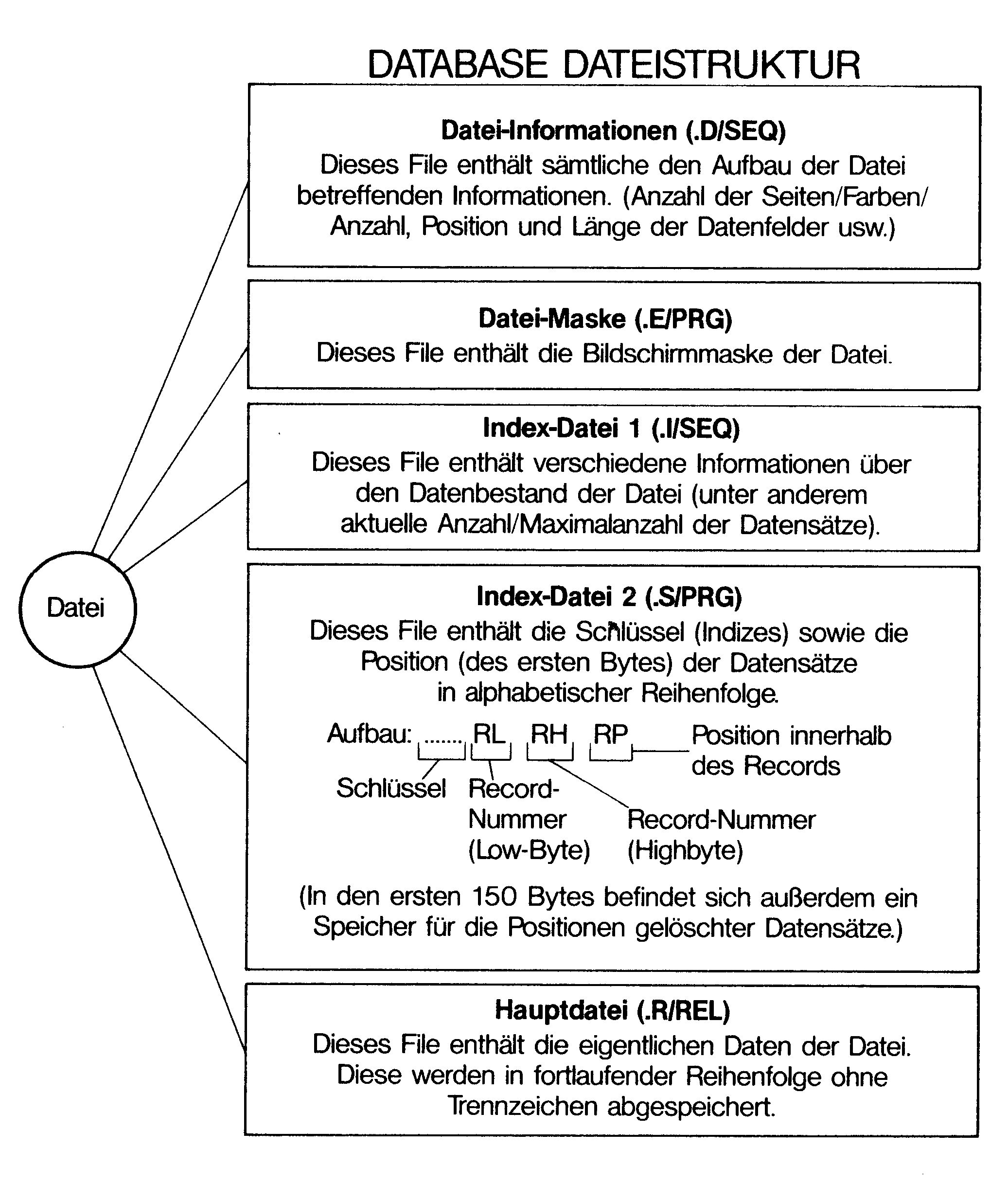 Eine Dateiverwaltung wie Database ist ein Programm, mit dem Sie beliebige Arten von Dateien verwalten können. Im Gegensatz zu zum Beispiel einer Adressenverwaltung, bei der über ein vorgegebenes Eingabeschema (zum Beispiel »Name«, »Vorname«, »Strasse«, »Wohnort«, etc.) eben nur Adressen eingegeben werden können, sind Sie bei Database in der Wahl des Eingabeschemas (der sogenannten »Eingabe-« oder »Dateimaske«) völlig frei, das heißt, Sie können die Bereiche (die sogenannten »Datenfelder«), in die später Daten eingegeben werden sollen, an beliebigen Positionen auf dem Bildschirm verteilen. Darüber hinaus kann sich die Eingabemaske überinsgesamt fünf (!) Bildschirmseiten erstrecken. Und natürlich können Sie das Ganze mit beliebigen Kommentaren und »Verzierungen« versehen. Dafür steht Ihnen der gesamte Zeichensatz des Computers zur Verfügung.