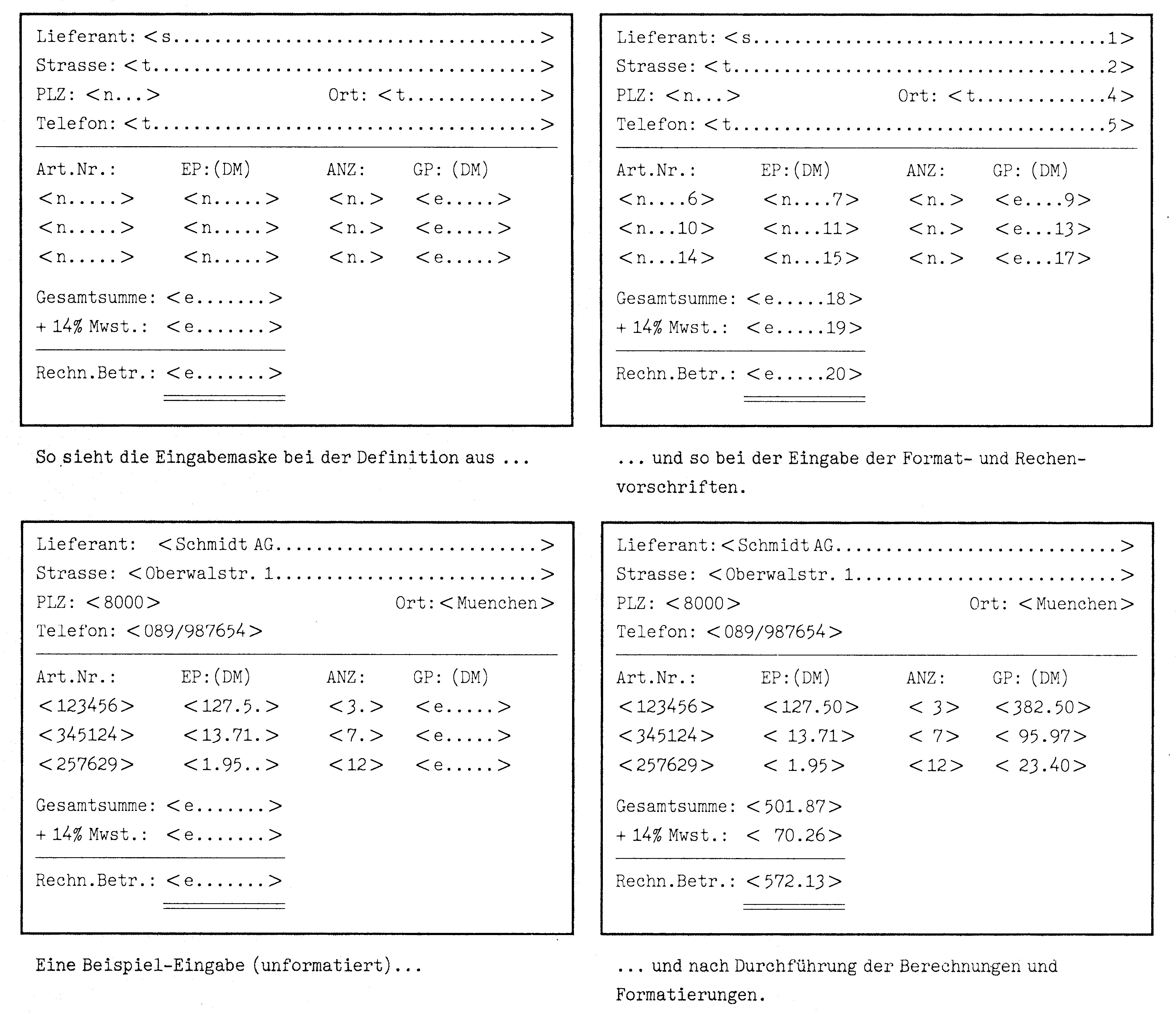 Um das bisher Gesagte zu verdeutlichen, soll an einem praktischen Beispiel - einer kleinen Rechnungsverwaltung - die Entwicklung einer Datei demonstriert werden. Sehen Sie sich dazu bitte Bild 4 an: Links oben sehen Sie die Eingabemaske so, wie Sie sie bei der Definition eingeben müssen. Dabei dürfte es wohl keine Schwierigkeiten geben. Als Schlüsselfeld wurde das Feld »Lieferant« gewählt. Die Felder »Artikelnummer« (Art.Nr.), »Einzelpreis« (EP) und »Anzahl« (ANZ) sind numerische Felder. Bei den Feldern »Gesamtpreis« (GP), »Gesamtsumme«, »Mehrwertsteuer« und »Rechnungsbetrag« handelt es sich um Rechenfelder. Das »Telefon«-Feld wurde, da es auch nichtnumerische Zeichen enthält (»/« beziehungsweise»—« zur Abtrennung der Vorwahl), nicht als numerisches, sondern als Textfeld definiert.