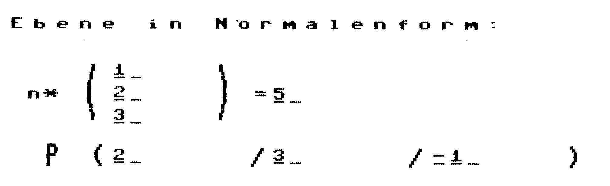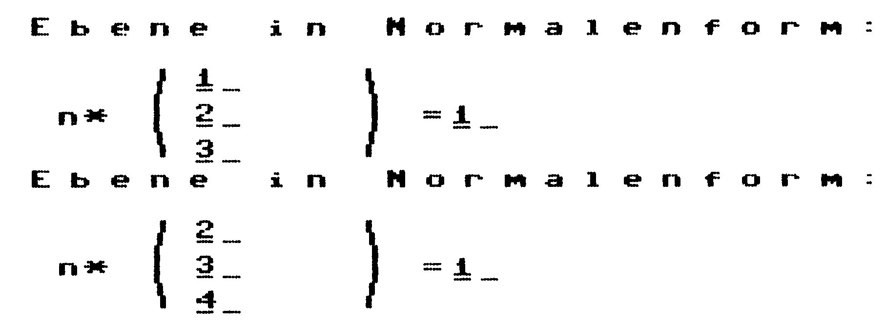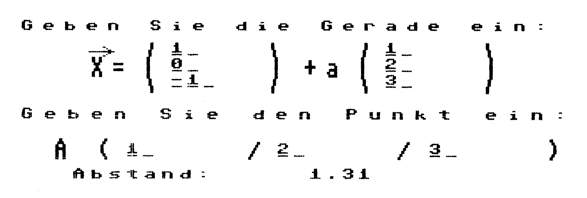 Alle erdenklichen Schnittprobleme von einer Geraden mit einer Ebene, zwei Geraden oder zwei Ebenen sind ganz einfach zu lösen und benötigen nicht mehr seitenlange Berechnungen. Auch Schnittwinkel, Projektion von Punkten und Umrechnungen von der Parameterform in die Normalenform der Ebene stellen kein Problem mehr dar. Jede Ausgabe erfolgt, sinnvoll auf zwei Stellen gerundet, auf dem Bildschirm, und kann mit der F1-Taste als Hardcopy auf jedem Drucker ausgegeben werden, der sich von Simons Basic ansprechen läßt. Das Programm arbeitet durchgehend mit HiRes-Grafik.