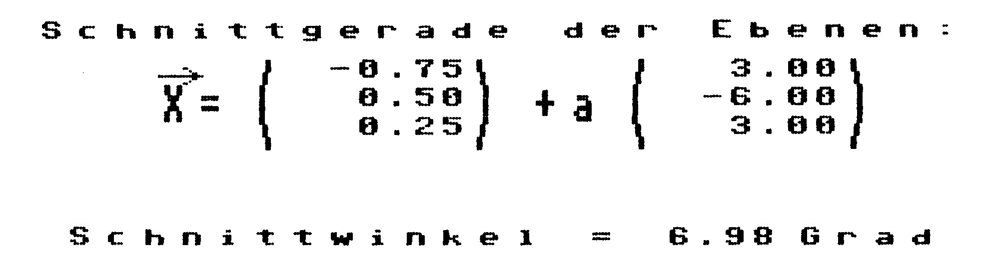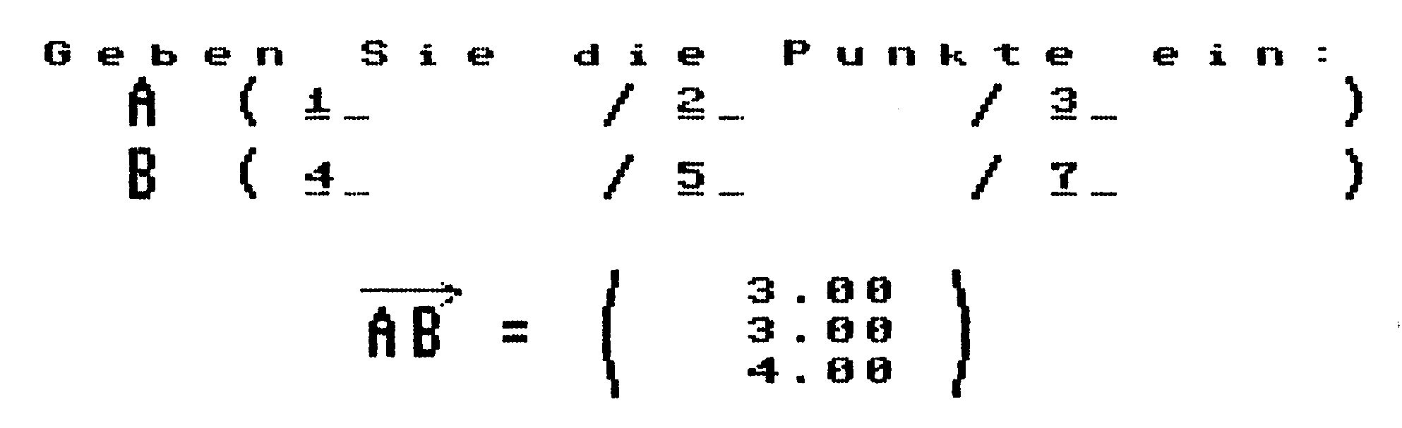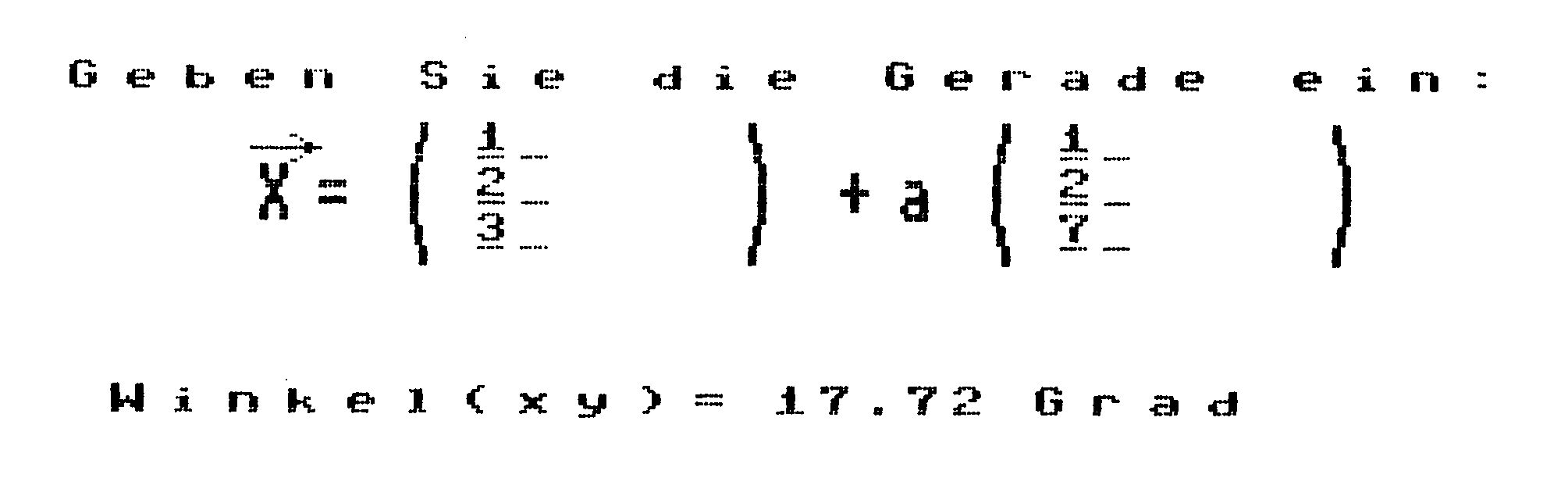 Alle erdenklichen Schnittprobleme von einer Geraden mit einer Ebene, zwei Geraden oder zwei Ebenen sind ganz einfach zu lösen und benötigen nicht mehr seitenlange Berechnungen. Auch Schnittwinkel, Projektion von Punkten und Umrechnungen von der Parameterform in die Normalenform der Ebene stellen kein Problem mehr dar. Jede Ausgabe erfolgt, sinnvoll auf zwei Stellen gerundet, auf dem Bildschirm, und kann mit der F1-Taste als Hardcopy auf jedem Drucker ausgegeben werden, der sich von Simons Basic ansprechen läßt. Das Programm arbeitet durchgehend mit HiRes-Grafik.