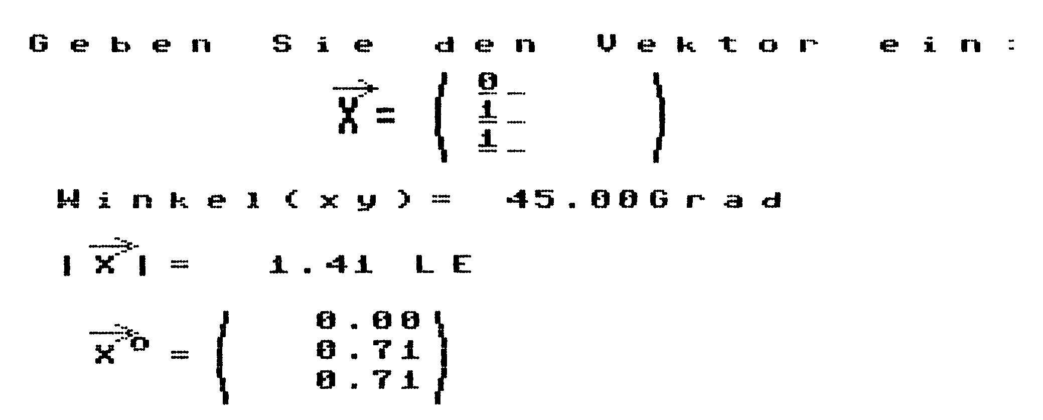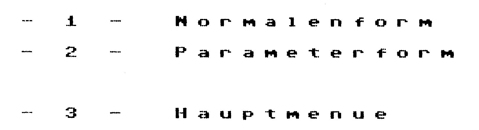 Bei »ZURÜCK MIT RETURN« können Sie durch drücken der SPACE-Taste dieselbe Rechnung mit anderen Zahlenwerten wiederholen. Jedesmal, wenn von Ihnen eine Eingabe verlangt wird, können Sie mit der Funktionstaste F1 eine Hardcopy des aktuellen Bildschirminhaltes auf dem Drucker erzeugen.