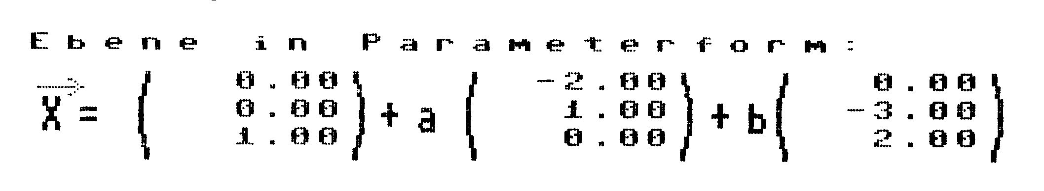 E: siehe oben $$ g: \vec{x} = \begin{pmatrix} g1 \\ g2 \\ g3 \end{pmatrix} + \lambda \cdot \begin{pmatrix} ux \\ uy \\ uz \end{pmatrix} $$ |