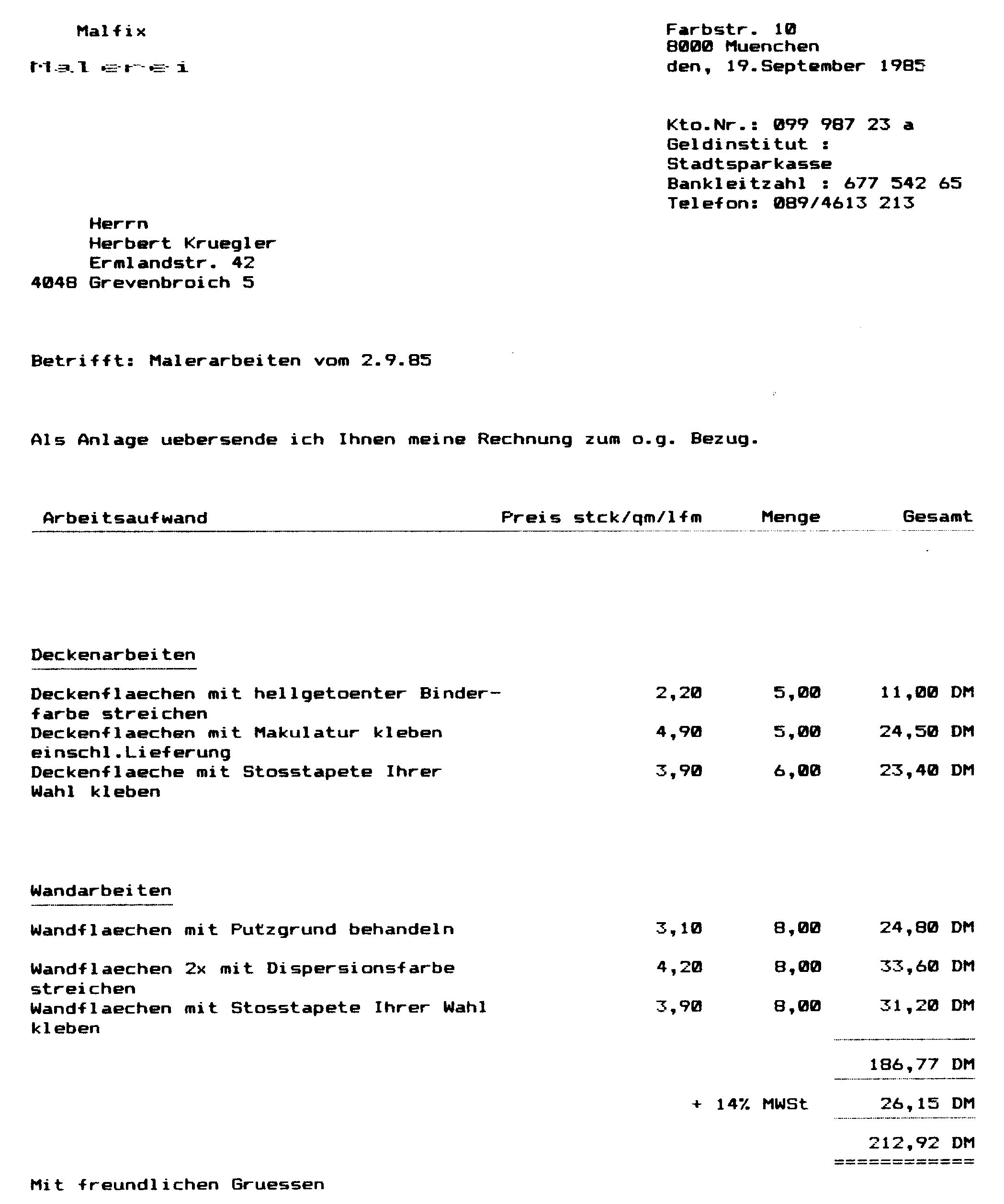 Das erste was Sie tun müssen, wenn Sie das Listing abgetippt haben, ist eine »Textdatei« zu erstellen. In dieser Textdatei sind alle möglichen Arbeiten Ihres Betriebes mit Einzelpreis verzeichnet. Jede Arbeit hat eine Schlüsselnummer. Später bei der Rechnungserstellung, brauchen Sie dann nur noch die entsprechende Nummer eingeben.