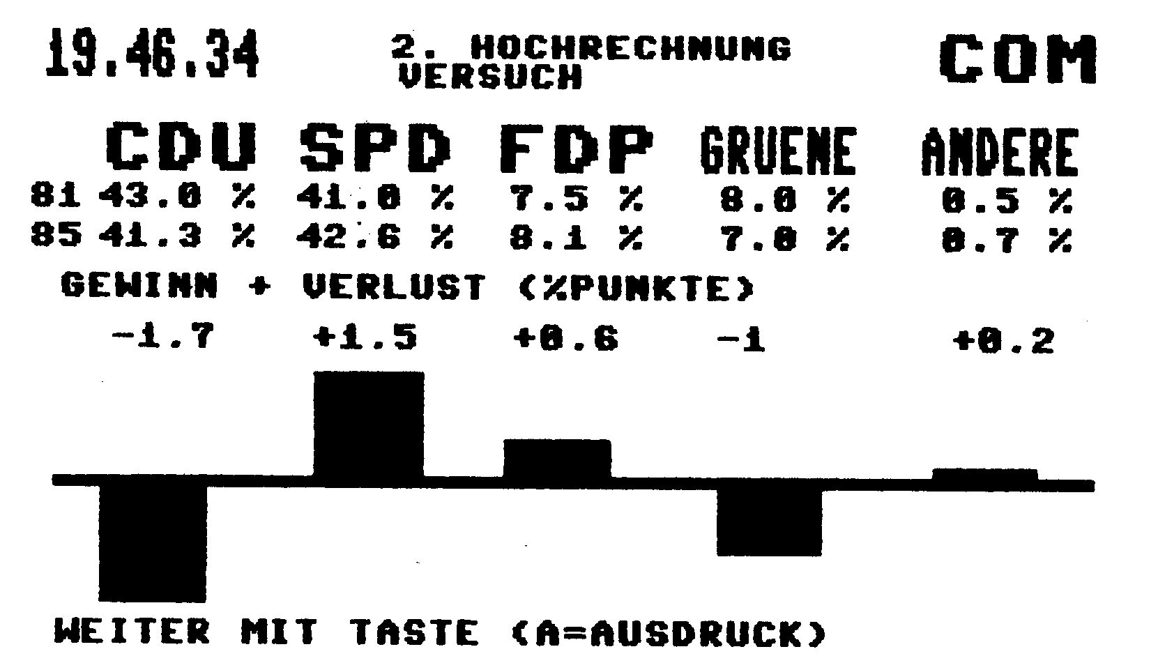 Wenn die Fernsehanstalten ARD und ZDF am Wahlsonntagabend ab 18 Uhr ihre Hochrechnungsschlacht austragen, kann man mit diesem Programmlisting endlich mitmischen. Durch die Mittelwertbildung aus den letzten beiden Hochrechnungen werden wahrscheinlich genauere Ergebnisse erzielt, als wenn die Hochrechnungen der beiden Sender nur getrennt betrachtet werden. Außerdem können mit diesem Programm das alte Ergebnis, die eingegebenen Hochrechnungen und das Endergebnis abgespeichert und als Grafik auf Bildschirm oder Drucker ausgegeben werden.