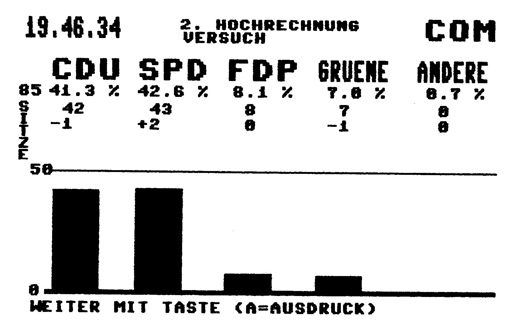 Soll eine alte Datei geladen werden, muß zuerst der Wahlname eingegeben werden (kann auch mit »*« abgekürzt werden). Dann erscheint eine Auflistung der verschiedenen Hochrechnungen mit Nummern. Paßt die ganze Liste nicht auf den Bildschirm, wird die Auflistung erst einmal angehalten und kann durch Drücken der Space-Taste wieder gestartet werden. Soll eine Hochrechnung zur grafischen Darstellung ausgewählt werden, muß die davorstehende Zahl mit beiden Stellen eingegeben werden (ohne RETURN). Zu dieser Auflistung kommt man auch, wenn man bei der Real-Time-Hochrechnungseingabe »G« für Grafik drückt.